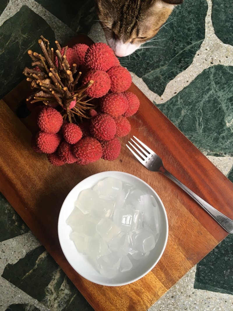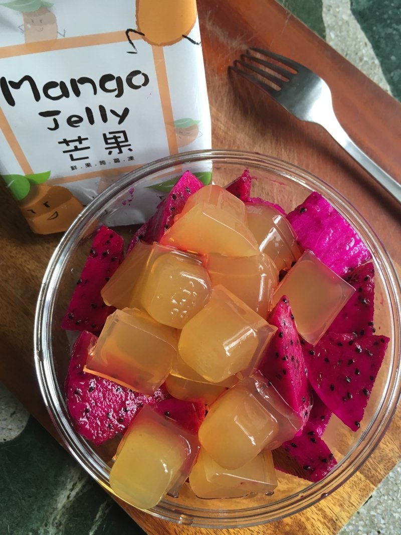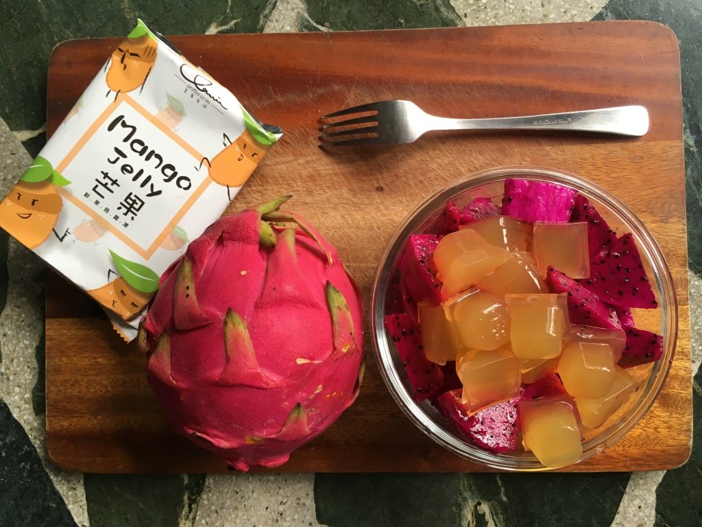 吃著吃著,我突發奇想,把火龍果與芒果蒟蒻加在一起,不知道好不好吃?沒想到不只顏色鮮艷看起來胃口大開,吃起來更是完美融合。下午茶時間切一顆火龍果配一盒芒果蒟蒻,再配一杯爽口冰茶,完美!